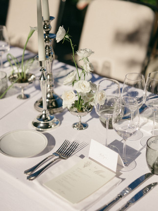 For dinner, we wanted to keep a modern look but also with the desire of keeping things simple and minimalist. We went for ikebana styled florals in silver cups to match the elegant / old money but modern aesthetic desired.